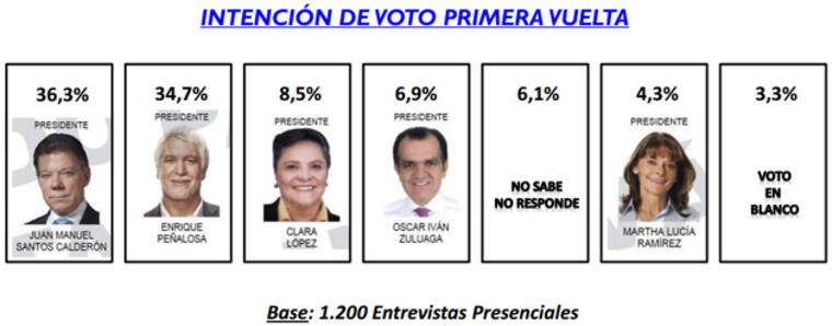 El candidato de los verdes, Enrique Peñalosa, con 26,1%, le ganaría en la primera vuelta al presidente y candidato Juan Manuel Santos, con 19,3% en Bogotá.