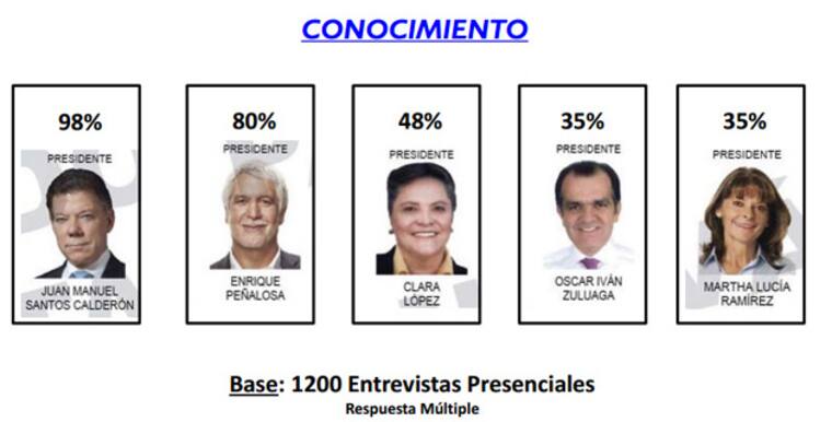 En cuanto al conocimiento de los candidatos, el 98% de los encuestados conoce al presidente y candidato Juan Manuel Santos, el 80% a Enrique Peñalosa; el 48% a Clara López, el 35% a Óscar Iván Zuluaga y el 35% a Martha Lucía Ramírez.