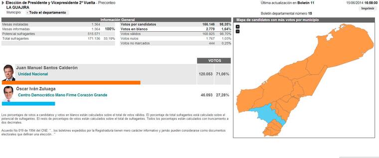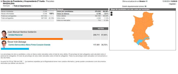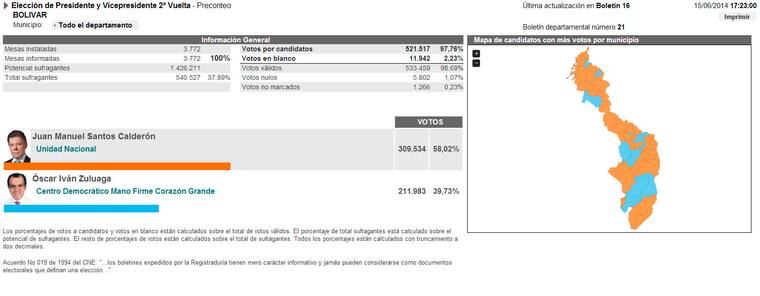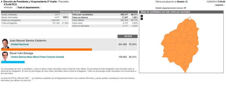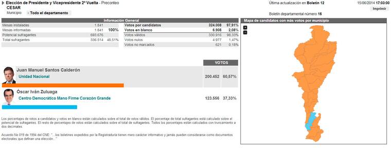 Hoy, los resultados le dieron la razón: con el 99% las mesas informadas, el mandatario, que fue avalado por la coalición Unidad Nacional (La U, Liberal, Cambio Radical), ganó de forma abrumadora en los ocho departamentos de la región. Santos obtuvo 2.011.241 votos contra 976.467 de su rival, Óscar Iván Zuluaga, del Centro Democrático. Lo que representa una diferencia de 1.034.774 votos entre los dos candidatos, superior a la distancia en el consolidado nacional que fue de 910.223 sufragios.