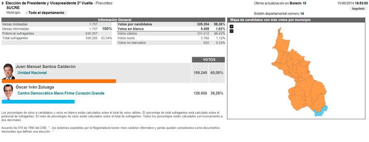En el departamento de Sucre Santos se impuso a Zuluaga con 199.249 votos (60,08%). El aspirante uribista recibió 126.955 (38,28%). El presidente reelegido venció en todos los municipios a excepción de Guaranda. A diferencia de la primera vuelta, el mandatario ganó en Sincelejo: logró 49.521 votos (53,02%) frente 41.416 (44,34%) de Zuluaga.