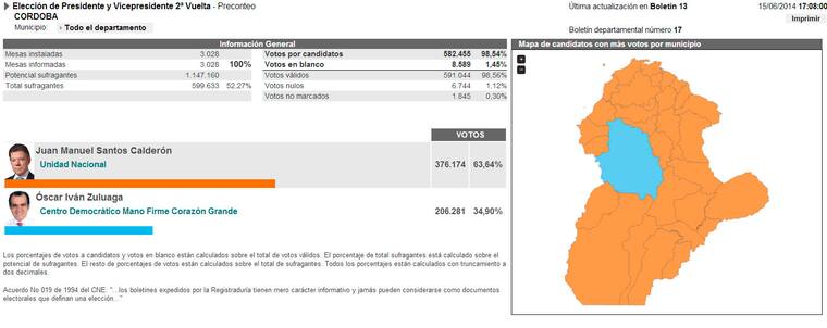El segundo departamento del Caribe que más le aportó votos a Santos fue Córdoba. El mandatario sumó 376.174 votos (63,64%) frente a 206.281 de Zuluaga (34,90%. Ganó en todos los municipios a excepción de la capital, Montería, donde se impuso el uribismo con 71.881 votos (51,74%).