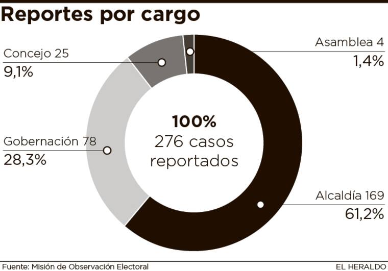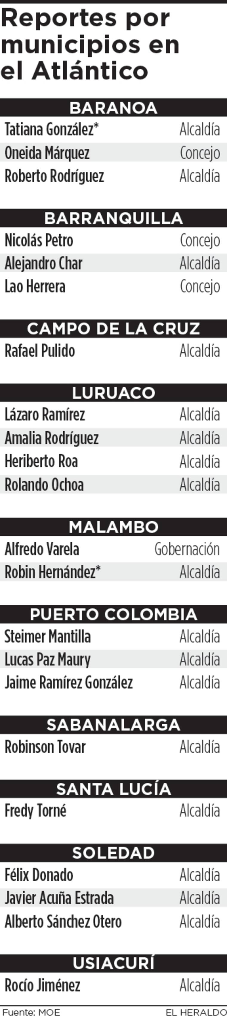 La mayoría de denuncias son a candidatos a las alcaldías municipales, (61.2% a nivel nacional). Destacan 3 casos a Concejo: Oneida Márquez en Baranoa, Lao Herrera y Nicolás Petro en Barranquilla; y un caso a la Gobernación, Alfredo Varela. Por otro lado los candidatos a la alcaldía de Malambo, Robin Hernández y de Baranoa, Tatiana González, cuentan con más de una denuncia por publicidad anticipada.