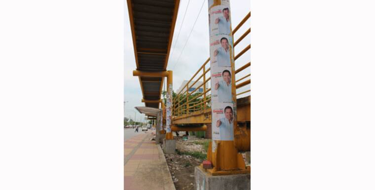 Publicidad de la candidata al Concejo Silvia Ibarra en la base del puente peatonal que está entre la oficina del Ministerio de Trasporte y el comando de la Policía Nacional.