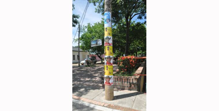 Afiches en un poste de los candidatos a la Alcaldía por el Centro Democrático, Carlos Ordosgoitia; al Concejo por el Partido Liberal, Orlando Benítez, y por el Polo, Jorge Garcés.