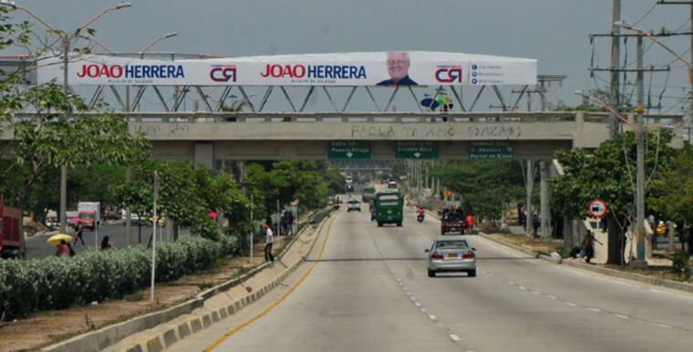 Barranquilla - Soledad. En la Circunvalar, en los límites entre Barranquilla y Soledad, se encuentra esta publicidad del candidato a la Alcaldía de este municipio, Joao Herrera, sobre el puente peatonal de Los Robles.