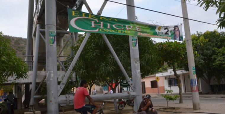 Pancarta política de Eikka Chicre instalada en el puente peatonal del barrio San Jorge, en la subida a Taganga. La violación de las normas electorales está cerca a un CAI de la Policía en la capital del