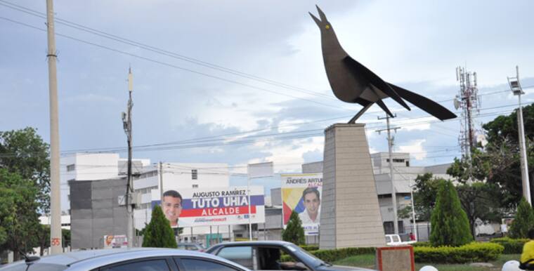 Publicidad de Augusto Ramírez (independiente) y Andrés Fernández (Opción Ciudadana), candidatos a la Alcaldía, con vallas publicitarias en las inmediaciones de la glorieta del monumento a la María Mulata.