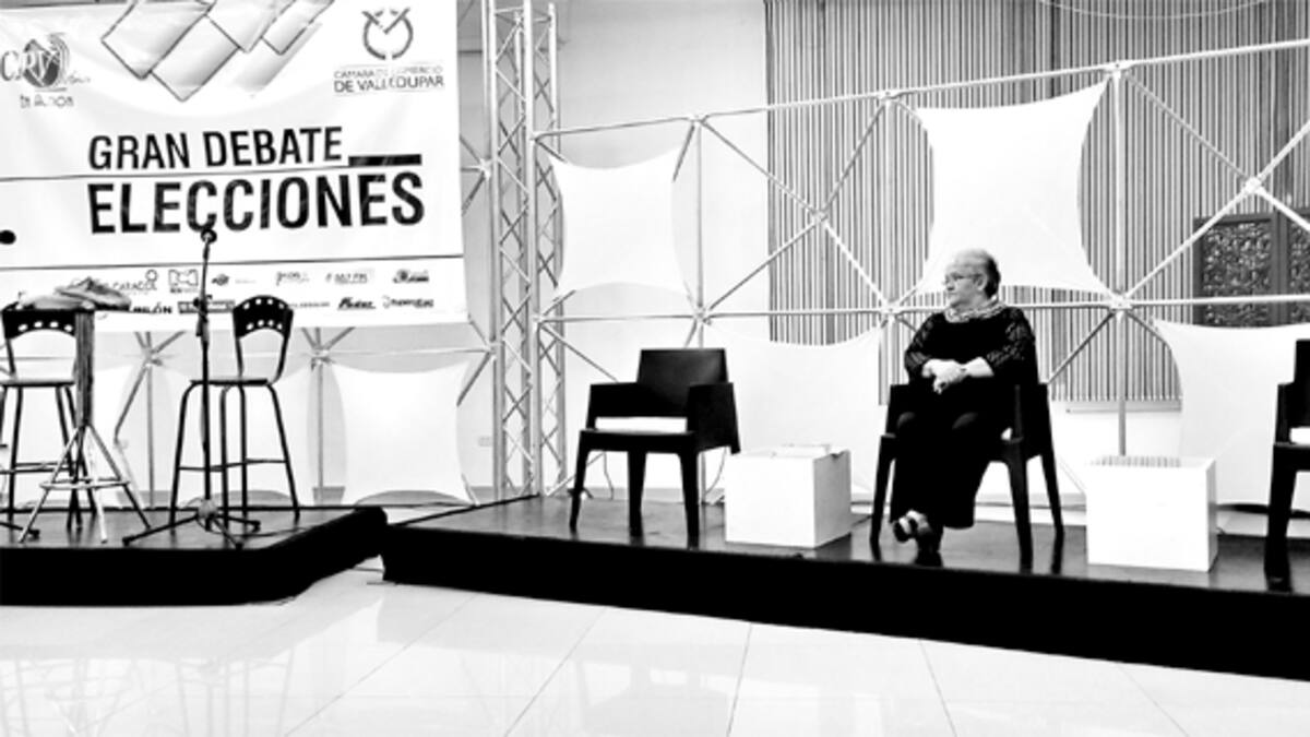 Papeles en mano, pelo blanco, vestida de negro de pies a cabeza, bufanda y labial rosa, Imelda Daza Cotes esperó en su último debate por la Gobernación del Cesar, convocado por el Círculo de Periodistas de Valledupar y la Cámara de Comercio de la ciudad, más de 40 minutos para que llegara el primero de sus contrincantes, Arturo Calderón, apoyado por el Partido Liberal y el Centro Democrático. El segundo, Francisco Ovalle, gobernador electo del Partido de la U, nunca llegó. Mandó una carta explicando que tenía Laringitis aguda.