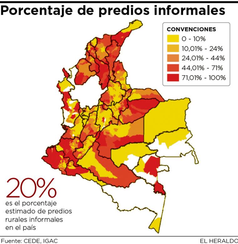Estudios realizados por el Centro de Estudios sobre Desarrollo Económico (CEDE) de Uniandes, estiman que uno de cada cinco predios rurales en el país tiene problemas de este tipo y la mitad de los pequeños campesinos en Colombia no tienen formales derechos sobre la tierra.