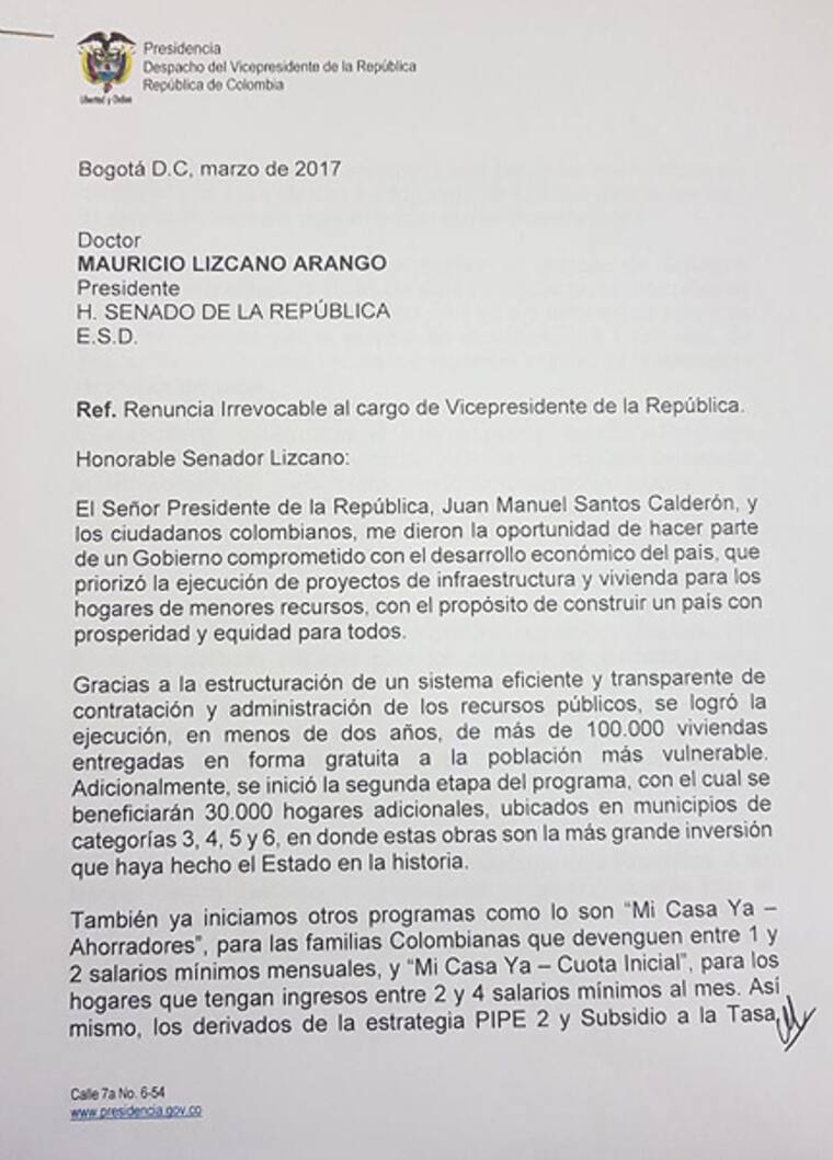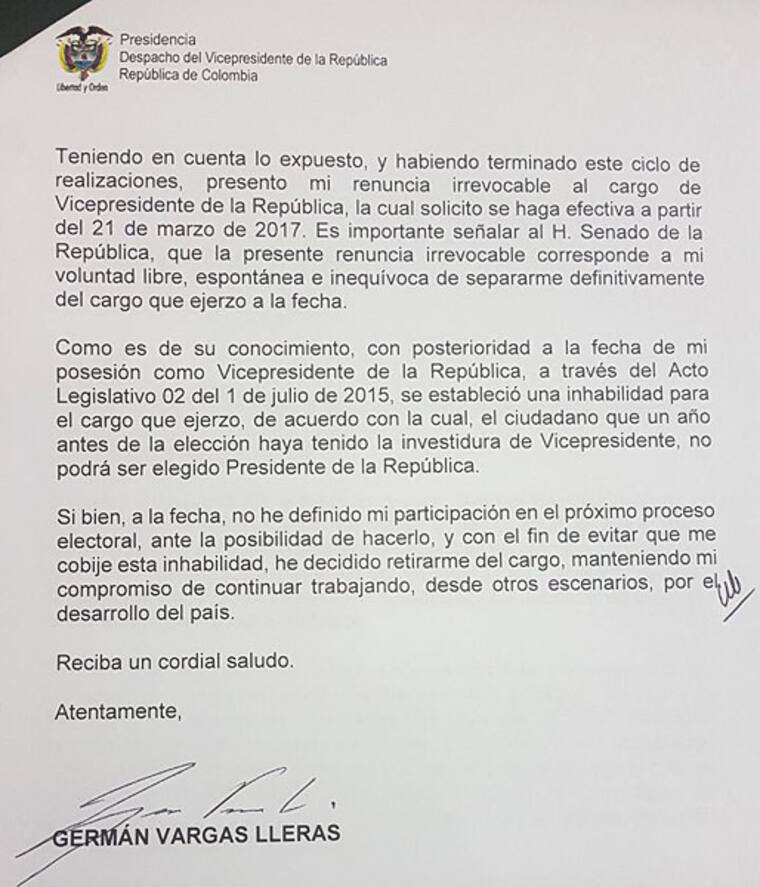 'Acabo de recibir la renuncia del señor vicepresidente del señor Germán Vargas Lleras la cual fue presentada a partir del próximo martes 21 de marzo, solicitud que hiciera para no tener que convocar al Congreso durante el puente festivo', afirmó el presidente del Senado, Mauricio Lizcano, el miércoles por la noche cuando recibió el documento.