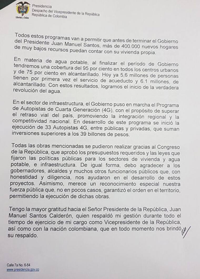 En la carta, Vargas Lleras se refiere a su gestión al frente de la vicepresidencia, habla de los programas de infraestructura que lideró, como Mi Casa Ya, las vías 4G o la construcción de acueductos. Agradece profundamente la confianza que el presidente Juan Manuel Santos , de quien destaca 'siempre respaldó mi gestión'