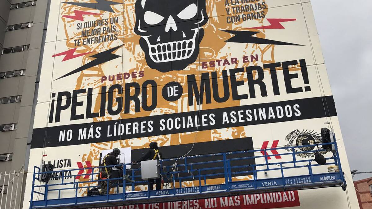 En un mural de 30 metros cuadrados, sobre una de las carreras más transitadas de Bogotá (la Séptima) se cuenta, uno por uno, el número de líderes sociales asesinados desde la firma del Acuerdo de Paz.