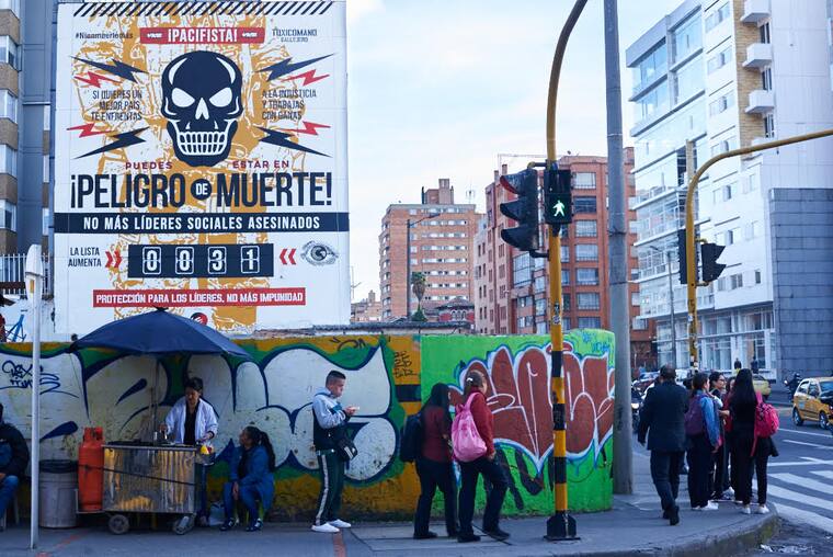 En un mural de 30 metros cuadrados, sobre una de las carreras más transitadas de Bogotá (la Séptima) se cuenta, uno por uno, el número de líderes sociales asesinados desde la firma del Acuerdo de Paz.