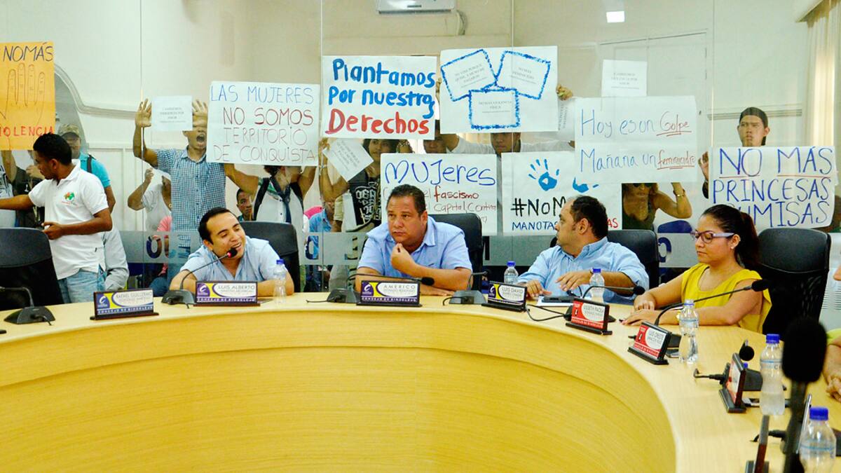 Le exijo respeto', acotó Manotas, dirigiéndose a Vergara. El presidente del Concejo, Manuel Barrios Gil, dijo que la corporación no tiene dentro de sus funciones proceder en contra de Manotas hasta que una autoridad judicial lo ordene, y dijo que confía en que todo se resuelva a la luz de la justicia. Al tiempo que se realizaba la sesión, la Fundación Hijos Sucre organizó un plantón a las afueras del Concejo para exigir la reivindicación de los derechos de las mujeres.