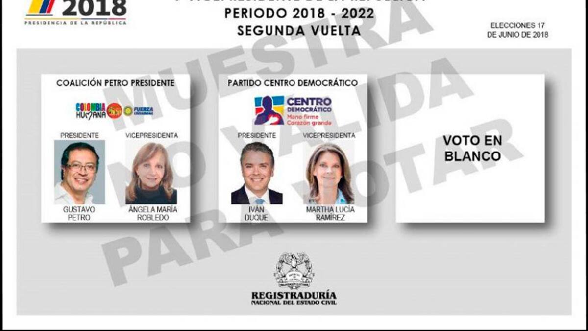 En el tarjetón se puede ver primero al candidato Gustavo Petro, acompañado de su vicepresidenta, y a un lado al del Centro Democrático Iván Duque.