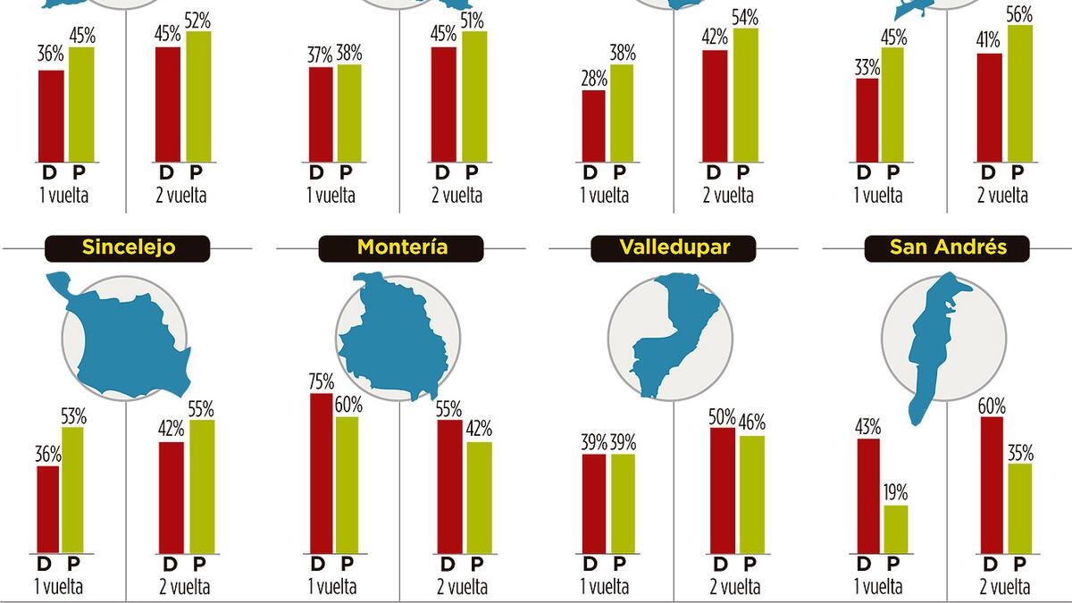 Como lo anotó César Lorduy, si bien Duque ganó en seis de los ocho departamentos del Caribe, Petro se quedó con cinco de las ciduades capitales: Barranquilla, Santa Marta, Cartagena, Sincelejo y Riohacha. Fue la votación de estos lugares la que ale permitió consolidar una diferencia regional de tan solo 219.103 votos con su contendor Duque. 'Aunque Petro contaba con más votos en el Caribe, en realidad no le fue tan mal. En Cúcuta, por ejemplo, Duque le dobla la votación. Hay que recordar que tenía todos los partidos, y todo el aparato detrás suyo', expresó el docente de Uninorte.