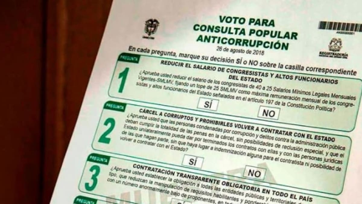 La Consulta Nacional Anticorrupción que se vota hoy en todo el territorio colombiano, en el mismo horario y los mismos lugares de votación que las pasadas elecciones presidenciales, consta de siete preguntas a las que usted, si decide acudir a las urnas, deberá responder sí o no, relacionadas con la reducción del salario de los congresistas y altos funcionarios del Estado y el cumplimiento de penas en cárceles, sin posibilidad de reclusión especial, para corruptos, además de la prohibición de volver a contratar con el Estado.