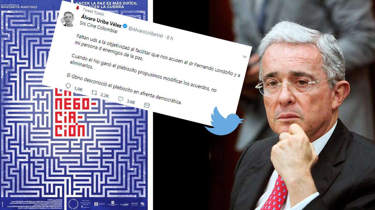 'Señores Cine Colombia: Faltan ustedes a la objetividad al facilitar que nos acusen al doctor Fernando Londoño y a mi persona de enemigos de la paz', sentenció Uribe, comenzando un debate en redes sociales.