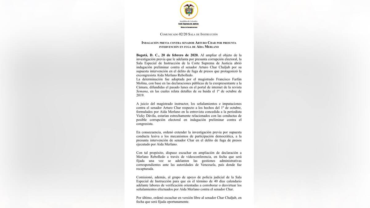 La Corte Suprema de Justicia informó ayer que abrió una indagación previa contra el senador barranquillero Arturo Char, de Cambio Radical, por su presunta participación en la fuga de la excongresista Aida Merlano.