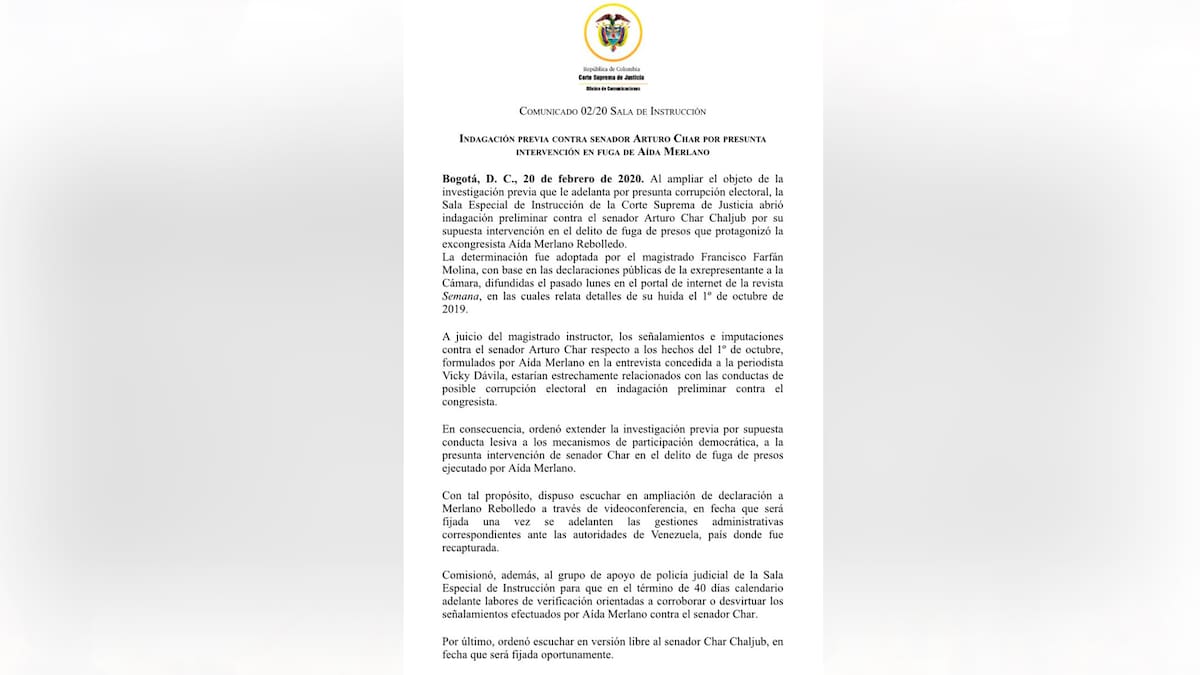 La Corte Suprema de Justicia informó ayer que abrió una indagación previa contra el senador barranquillero Arturo Char, de Cambio Radical, por su presunta participación en la fuga de la excongresista Aida Merlano.