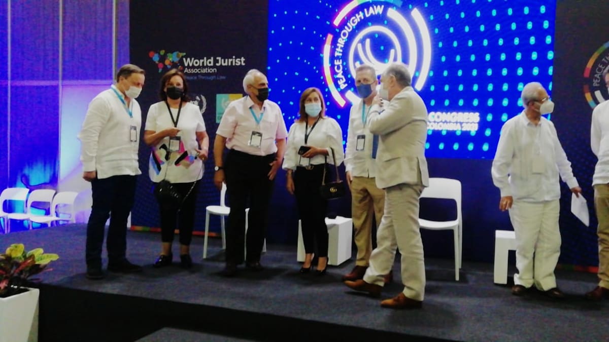 Al término del panel, el abogado presidente del Congreso Mundial de Juristas, Javier Cremades entregó una distinción al político colombiano por los esfuerzos y trayectoria en el trabajo de fortalecer la democracia.