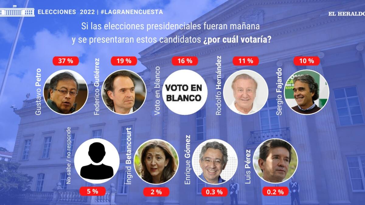 De acuerdo con La Gran Encuesta de la alianza de medios, entre ellos EL HERALDO, si las elecciones a la Presidencia fueran mañana, Gustavo Petro obtendría el 37% de los votos, seguido de Federico Gutiérrez con el 19% y el voto en blanco, con 16%.