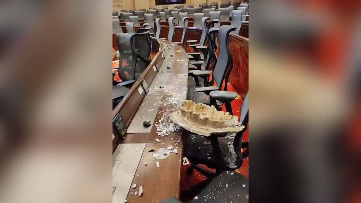 En imágenes difundidas en redes sociales, se nota como en el salón cayeron escombros del techo, algunos justo en puestos de congresistas, con la fortuna de que en el momento del temblor no había actividad.