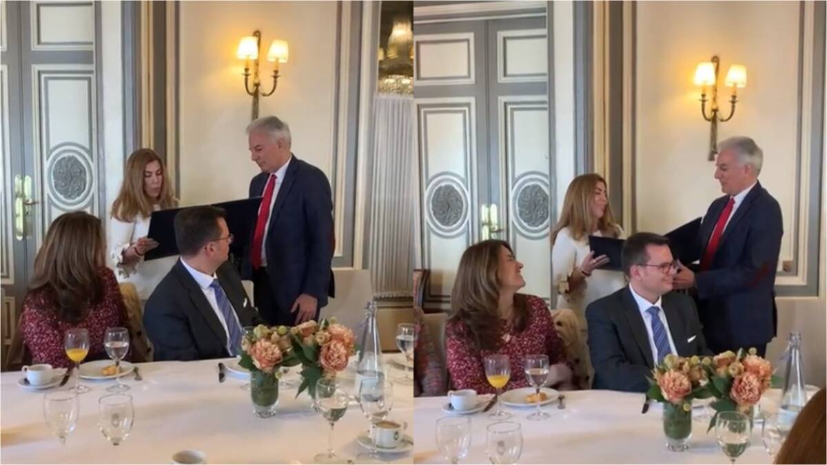 En Madrid, España, una delegación del Centro Democrático encabezada por el expresidente Álvaro Uribe Vélez y la directora del partido, Nubia Stella Martínez, le entregó al escritor el reconocimiento.