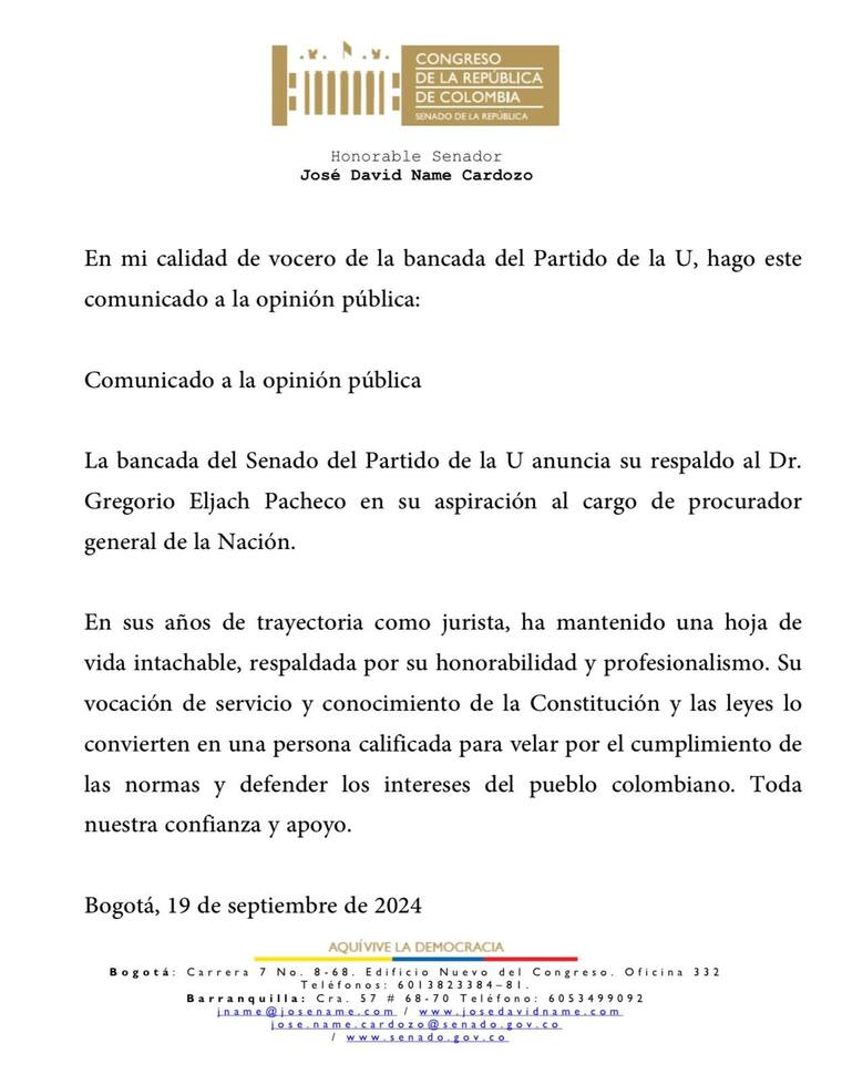 Por medio de una carta, firmada por el presidente Gustavo Petro, y dirigida al presidente del Senado, Efraín Cepeda, el jefe de Estado confirmó a Gregorio Eljach como su candidato para integrar la terna a procurador.