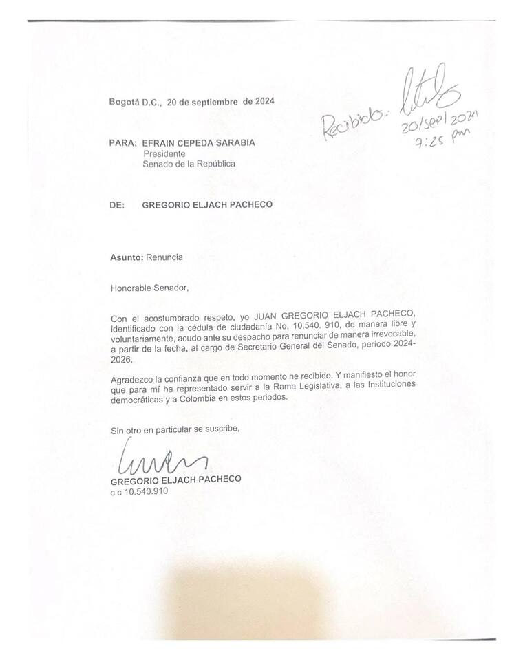 A través de una carta dirigida al presidente del Senado, Efraín Cepeda, Gregorio Eljach presentó su renuncia al cargo de secretario general del Senado.