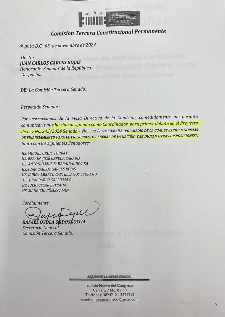 El presidente de la Comisión Tercera del Senado, Juan Pablo Gallo, del Partido Liberal, escogió a los ponentes de primer debate de la polémica Ley de Financiamiento, considerada como una nueva reforma tributaria para el país.
