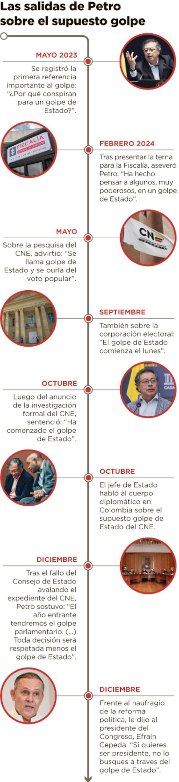 Casi que desde el siguiente año de haber asumido el poder, el presidente Gustavo Petro ha insistido en que se trama un golpe de Estado en su contra desde distintas instituciones, sectores políticos y hasta grupos criminales: en 2024 el más reciente pronunciamiento fue alrededor del expediente que revisa el Consejo Nacional Electoral, CNE, por presuntas irregularidades en la financiación de su campaña.