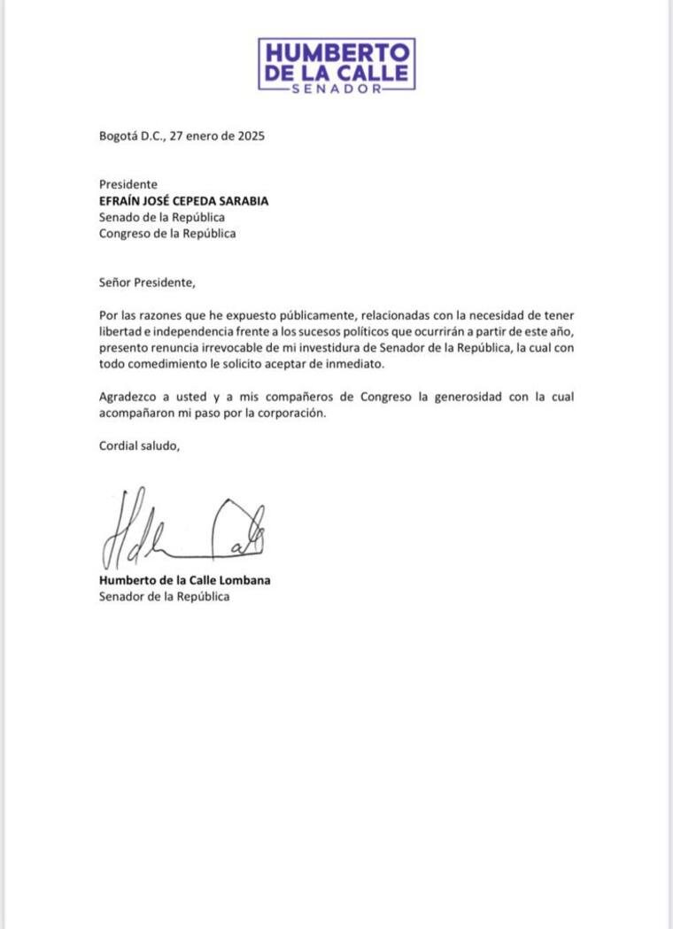 El senador Humberto de la Calle, del partido Verde Oxígeno, presentó este lunes 27 de enero la renuncia a su curul en la cámara alta del Congreso de la República.