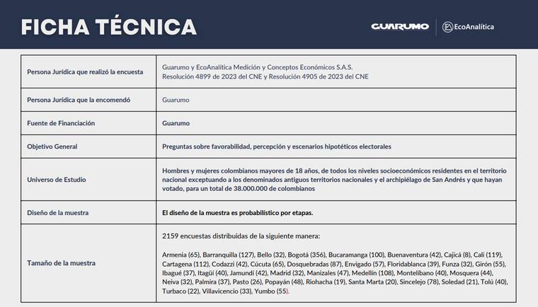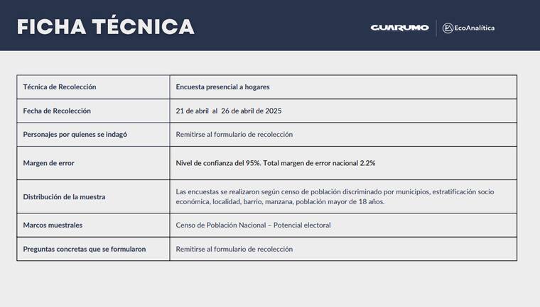 Guarumo señaló que fueron encuestados 2.159 personas, mayores de 18 años y que el estudio tiene un margen de error de 2,2 % y un nivel de confianza del 95 %.