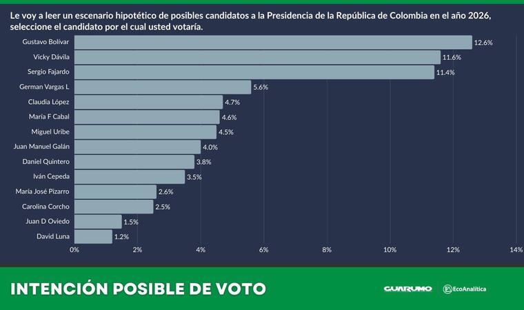 De acuerdo con la más reciente encuesta publicada por Guarumo y EcoAnalítica, los principales candidatos a la Presidencia de Colombia en las elecciones de 2026 son Gustavo Bolívar, Vicky Dávila y Sergio Fajardo.