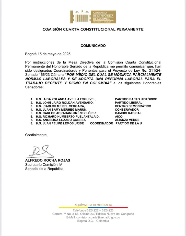 En la mañana de este jueves 15 de mayo, la Comisión Cuarta del Senado designó a los ponentes y coordinadores que se encargarán de radicar la ponencia de la resucitada reforma laboral del Gobierno para que se discuta en tercer debate.