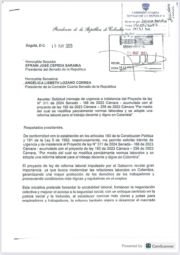 El Gobierno Nacional solicitó al Congreso de la República el trámite de urgencia e insistencia para el proyecto de ley que contiene la reforma laboral. La petición fue radicada este 15 de mayo ante la Comisión Cuarta del Senado, con el propósito de que la iniciativa sea priorizada en el orden del día y votada en un plazo no mayor a 30 días.