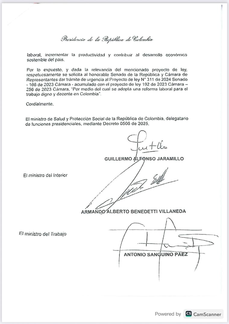 De acuerdo con los ministros firmantes —Guillermo Alfonso Jaramillo, delegado presidencial; Armando Benedetti, titular del Interior; y Antonio Sanguino, ministro del Trabajo—, la reforma pretende no solo ampliar la protección de derechos laborales, sino también impulsar la productividad y contribuir al crecimiento económico sostenible del país.