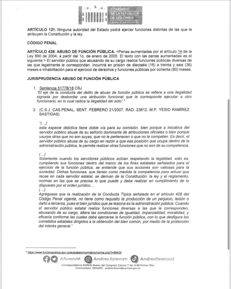 El congresista Andrés Forero Molina, miembro del partido Centro Democrático, presentó una denuncia formal ante la Fiscalía General de la Nación contra el ministro de Salud y Protección Social, Guillermo Alfonso Jaramillo, por el presunto delito de abuso de función pública, contemplado en el artículo 428 del Código Penal colombiano.