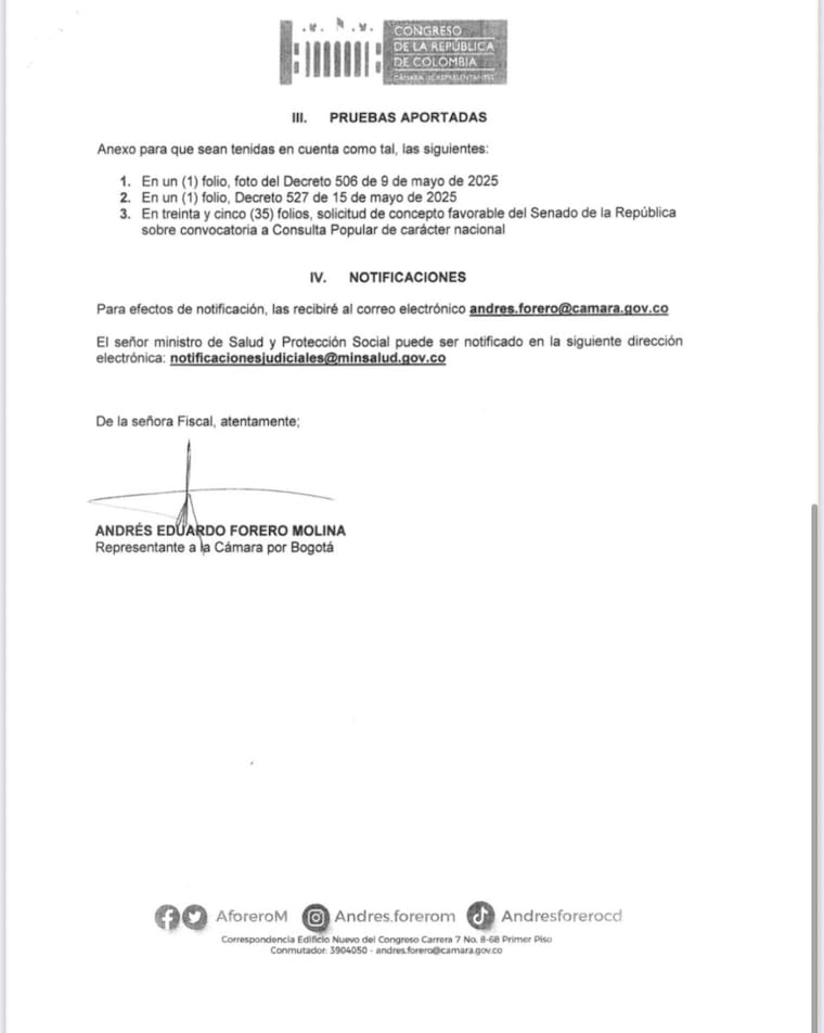 La denuncia fue acompañada de pruebas documentales que incluyen los decretos 506 del 9 de mayo y 527 del 15 de mayo de 2025, así como una solicitud de concepto favorable del Senado compuesta por 35 folios.