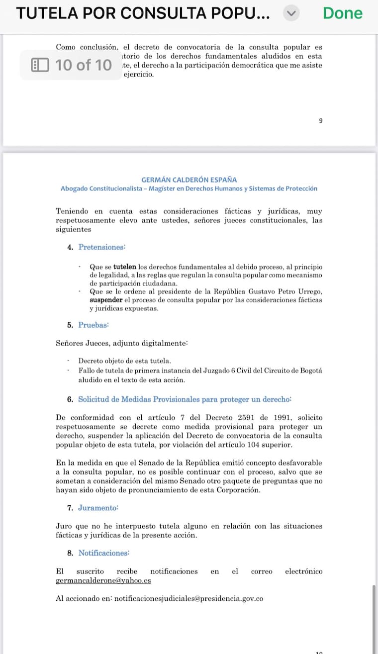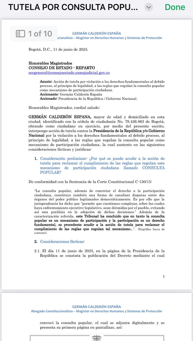 Según Calderón, el decreto presidencial —cuya copia adjuntó a la tutela— vulnera derechos fundamentales como el debido proceso, el principio de legalidad y las reglas constitucionales que enmarcan las consultas populares.