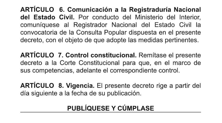 Entre tanto, el entrante ministro de Justicia, Eduardo Montealegre, dijo en su momento a la revista Semana que en el decreto está expresa la orden del mandatario al registrador Penagos para convocar a los colombianos a las urnas.