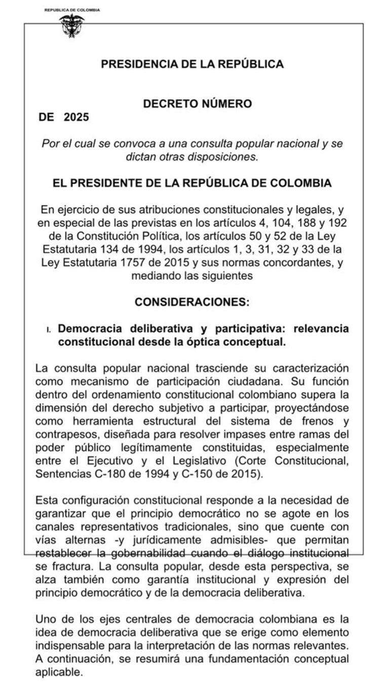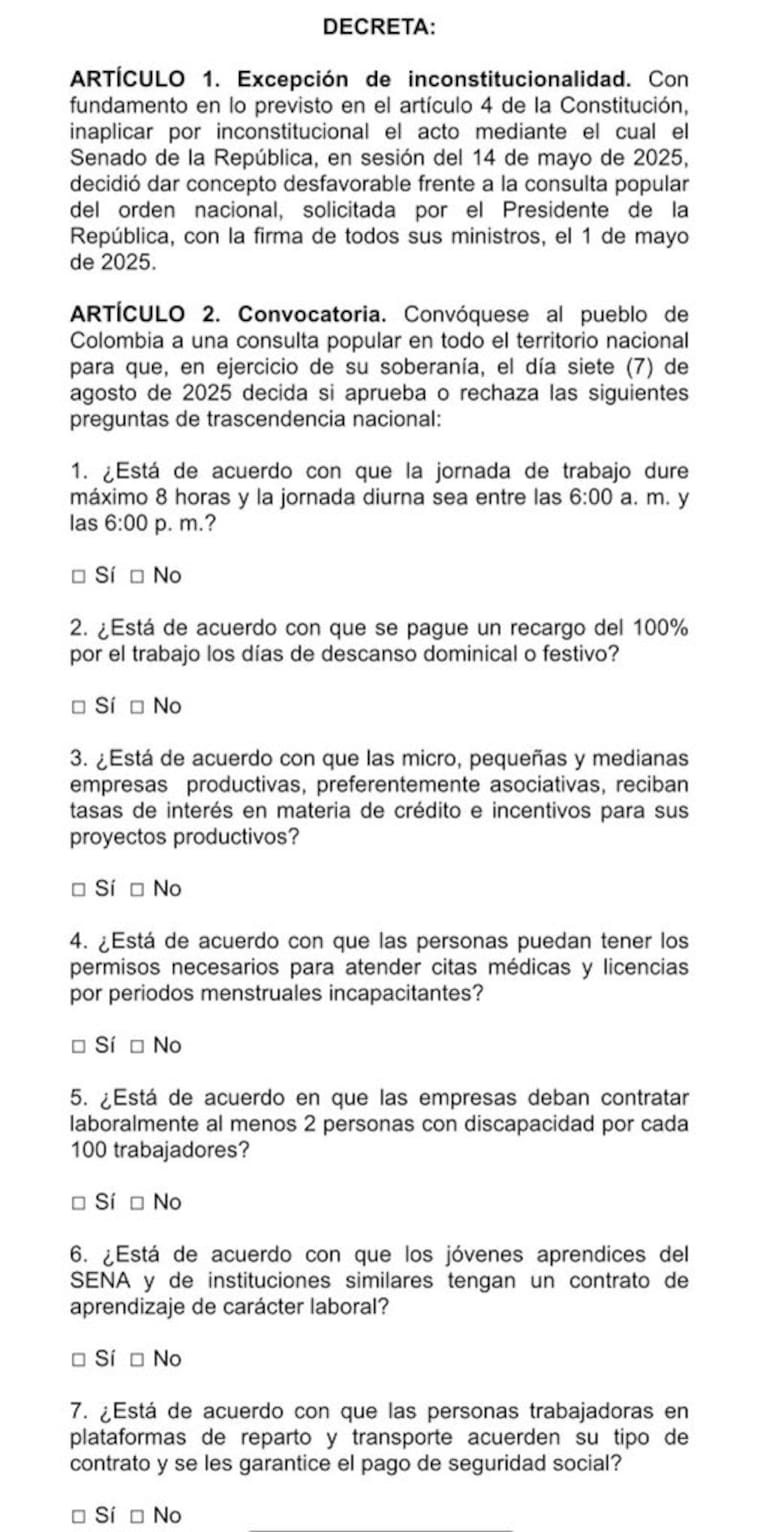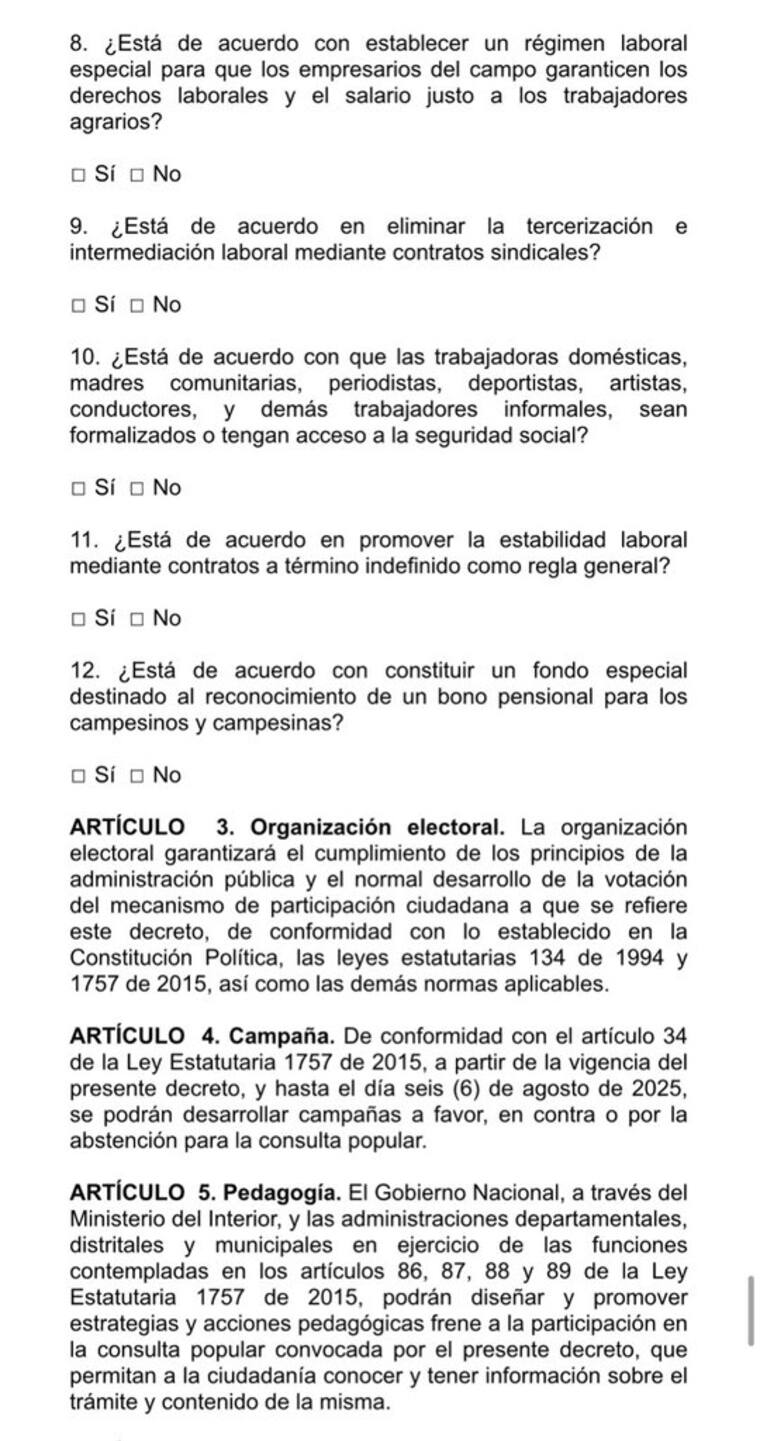 En su cuenta de X, el mandatario aseguró que esta normativa quedará sin efecto solo si el Congreso responde “positivamente” los puntos que se le preguntan al pueblo, es decir, lo que ha venido advirtiendo el ministro del Interior Armando Benedetti: si el Senado aprueba la reforma laboral como viene de la Cámara, entonces se derogará el decreto.
