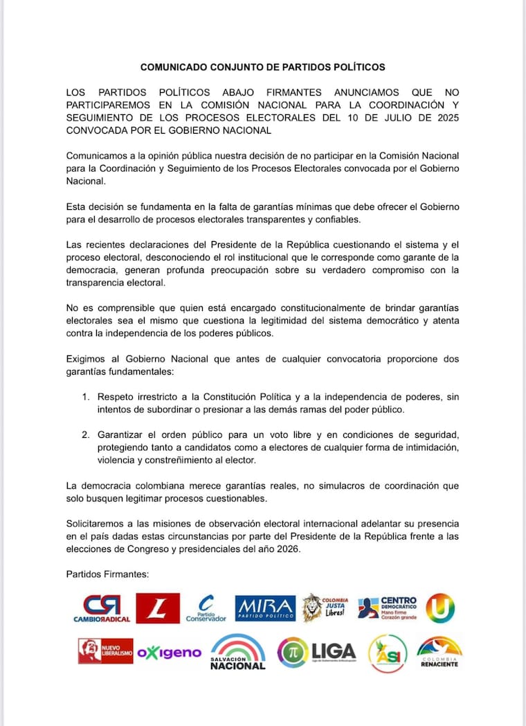 En ese sentido, exigieron al Gobierno nacional que antes de cualquier convocatoria proporcione dos garantías: “1. Respeto irrestricto a la Constitución Política y a la independencia de poderes, sin intentos de subordinar o presionar a las demás ramas del poder público. 2. Garantizar el orden público para un voto libre y en condiciones de seguridad, protegiendo tanto a candidatos como a electores de cualquier forma de intimidación, violencia y constreñimiento al elector”.