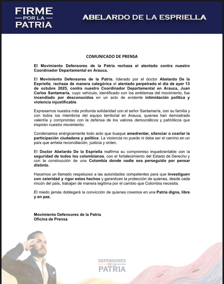 Asimismo, el Movimiento Defensores de la Patria, expresó su solidaridad con Juan Carlos Santamaría, con su familia y con todos los miembros del equipo territorial en Arauca, “quienes han demostrado valentía y compromiso con la defensa de los valores democráticos y patrióticos que inspiran nuestro movimiento”.