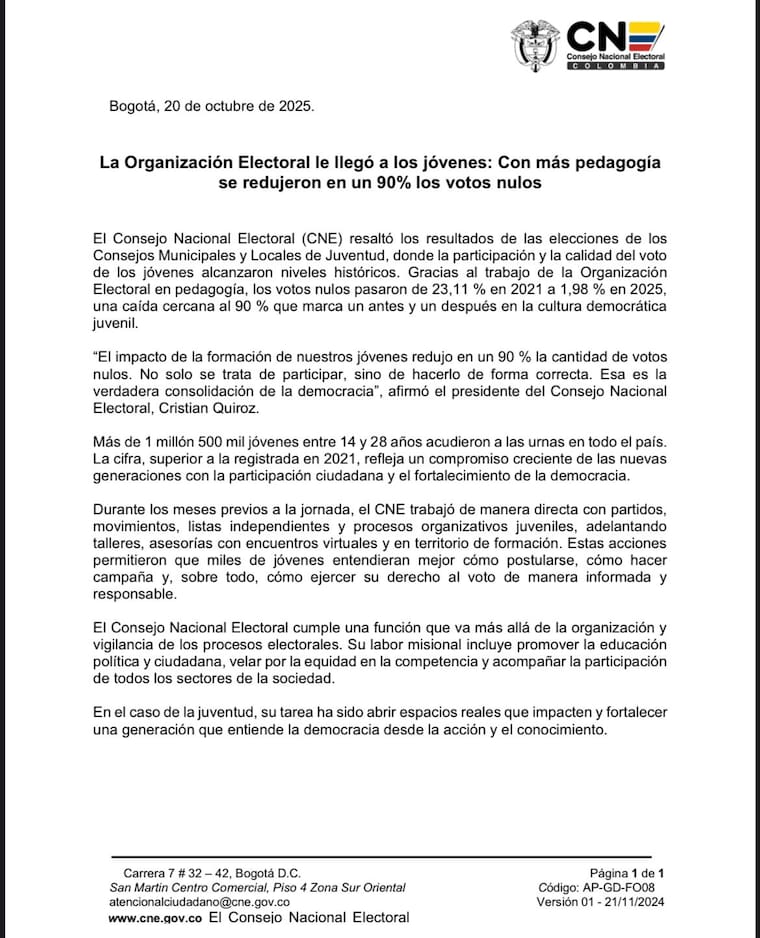 El Consejo Nacional Electoral afirmó que los resultados de 2025 marcan un punto de inflexión en la cultura democrática juvenil. La reducción de votos nulos y el aumento en la participación son, según el ente, una muestra de una generación que “entiende la democracia desde la acción y el conocimiento”.