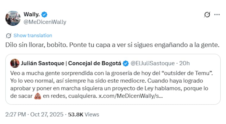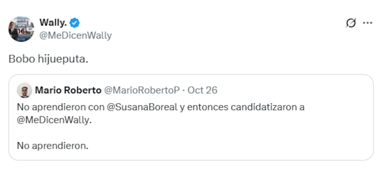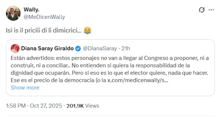 Este solo fue el principio de un ‘tire y afloje’ en X entre ambos, Giraldo se le fue de frente alegando que un personaje como él no estaría a la altura de la dignidad de senador que aunque aún no está elegido, la posición que ganó en la lista de su coalición le asegura una curul en el Congreso. “Ese es el precio de la democracia (o la ignorancia, más bien). ¿Se imaginan a esta persona debatiendo una tributaria, o una reforma al sistema nacional de participaciones?”. A esto Wally contestó en tono burlesco.