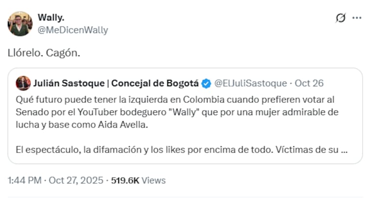 Quien también ‘llevó del bulto’ fue el concejal de Bogotá, Julián Sastoque, quien cuestionó que personas como la senadora de la Unión Patriótica, Aída Avella, fueron menos votados (quedó en la posición 10 y obtuvo 50.120 votos, 87.701 menos que Rodríguez Chaparro) que el “youtuber bodeguero”. De manera despectiva Wally le dijo: “Llórelo, cagón”.
