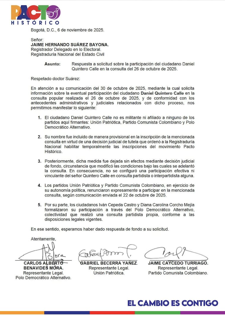 Con ello, el Pacto Histórico buscó aclarar cualquier duda sobre el rol de Quintero en el proceso y dejar constancia de que no formó parte de la consulta ni de sus resultados.