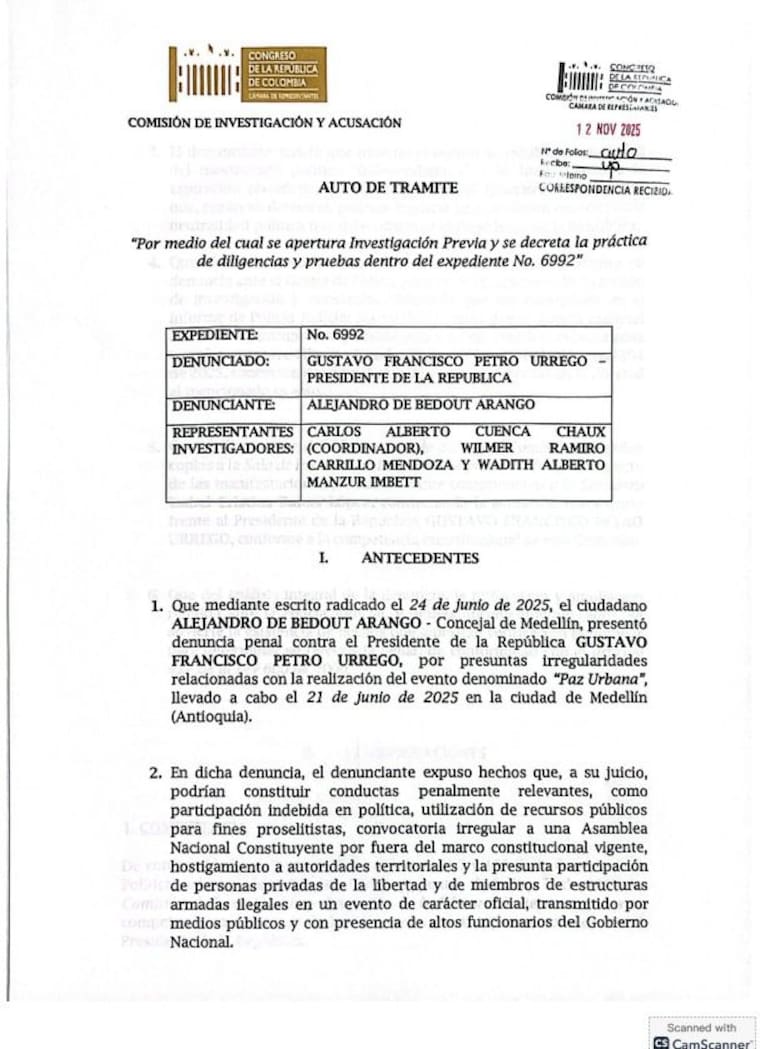 La denuncia consta en el expediente N° 6992, cuyo escrito fue radicado el 24 de junio de 2025. Los representantes investigadores serán: Carlos Alberto cuenca Chaux (coordinador), Wilmer Ramiro Carrillo Mendoza, y Wadith Alberto Manzur Imbett.